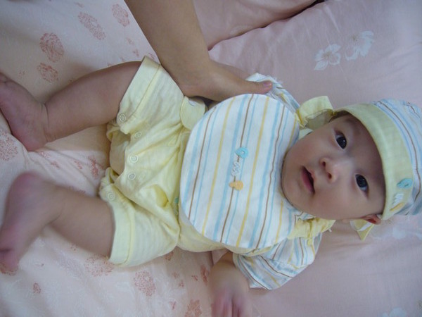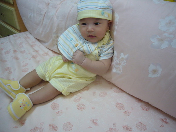 時光荏苒, 我家寶貝也三個多月了,這是今天全套黃色系的打扮,可愛嗎? 7公斤,6x公分 (因為寶寶總是扭來扭去,量不準耶) 最近昀昀仍喜歡邊睡覺邊喝奶,清醒時,一口都喝不下...昀昀,謝謝你所有美麗的,甜蜜的,新奇的,特別的。這一切因為有你共享,而變得好有價值。祝你健康平安的長大!